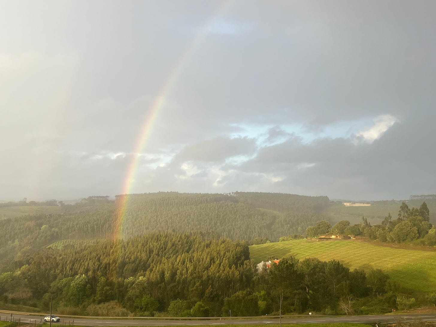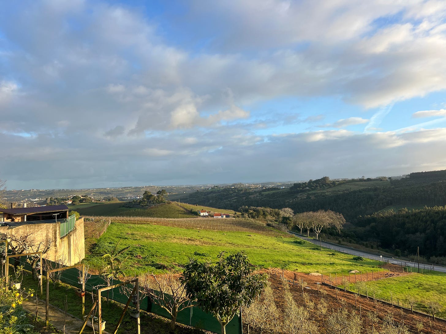 On the day of the great apagão, the April 2025 blackout that plunged Portugal and Spain into darkness, I sat on a deck overlooking a verdant valley at a wooden table festooned with wine corks, made by my neighbor V. Our two families pooled the food in our soon-to-be defrosted refrigerators and created a power outage feast — cooked shrimp with a sweet chili/mayonnaise sauce, fresh, crisp salad, slices of sweet fruit. V calmly surveyed the scene, a glass of red wine in his hand, and there was truly no cause for alarm in our little oasis. We were oblivious to the power outage or the time that had passed, until we heard church bells ringing and people in neighboring villages cheering. Then we knew there was light again.