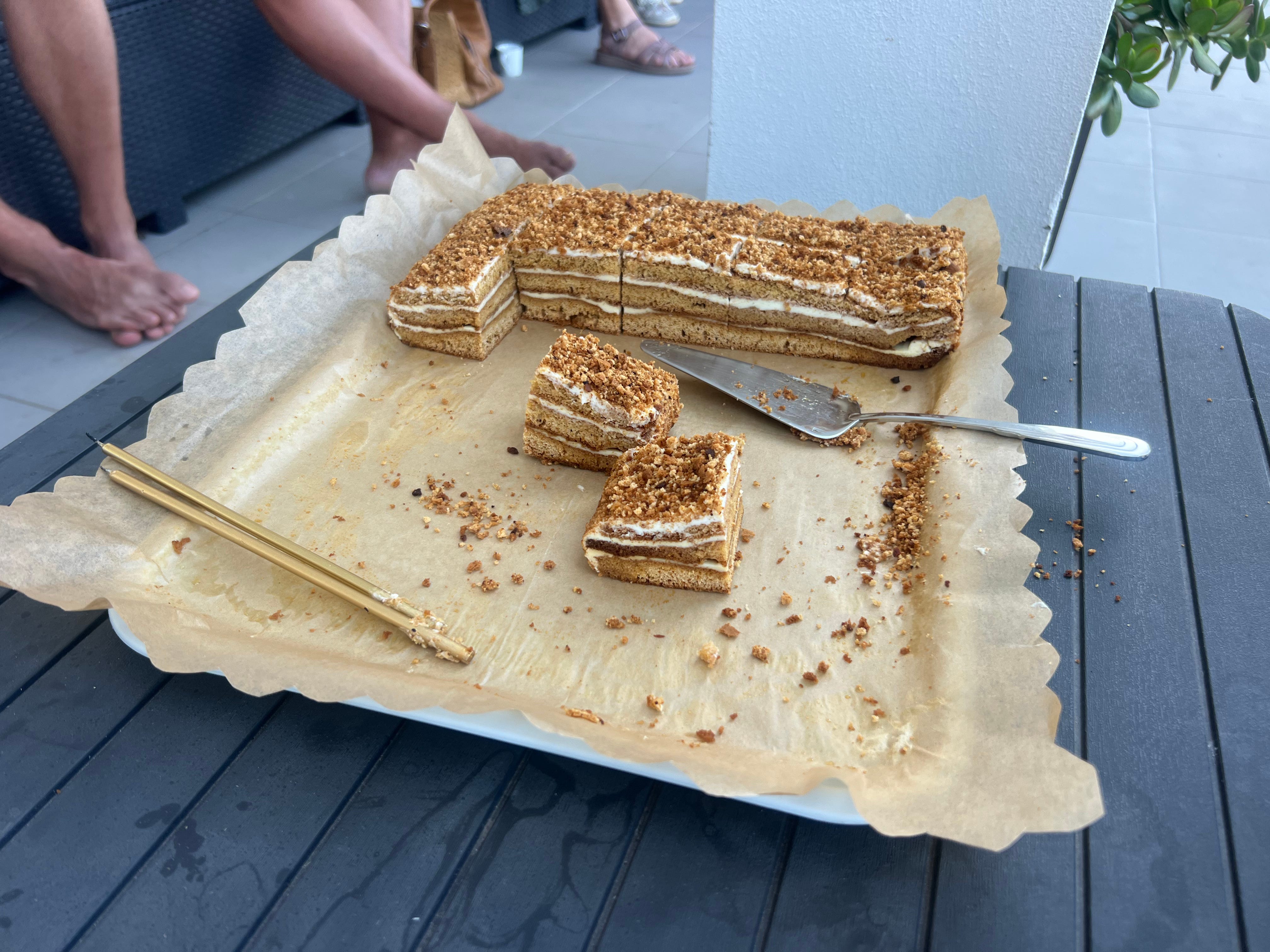 V’s sardines were the only sardines I’ve ever truly loved — fat and juicy and fresh off the grill, but maybe they tasted so good because the deck was bursting with people. The wooden table festooned with wine corks was full of food and an enormous honey cake had the place of honor in the center of the deck. V and V were wearing the Seattle sweatshirts we had given them for their birthdays. I was moved by the outpouring of love for them and grateful that J and I were welcomed into the fold.